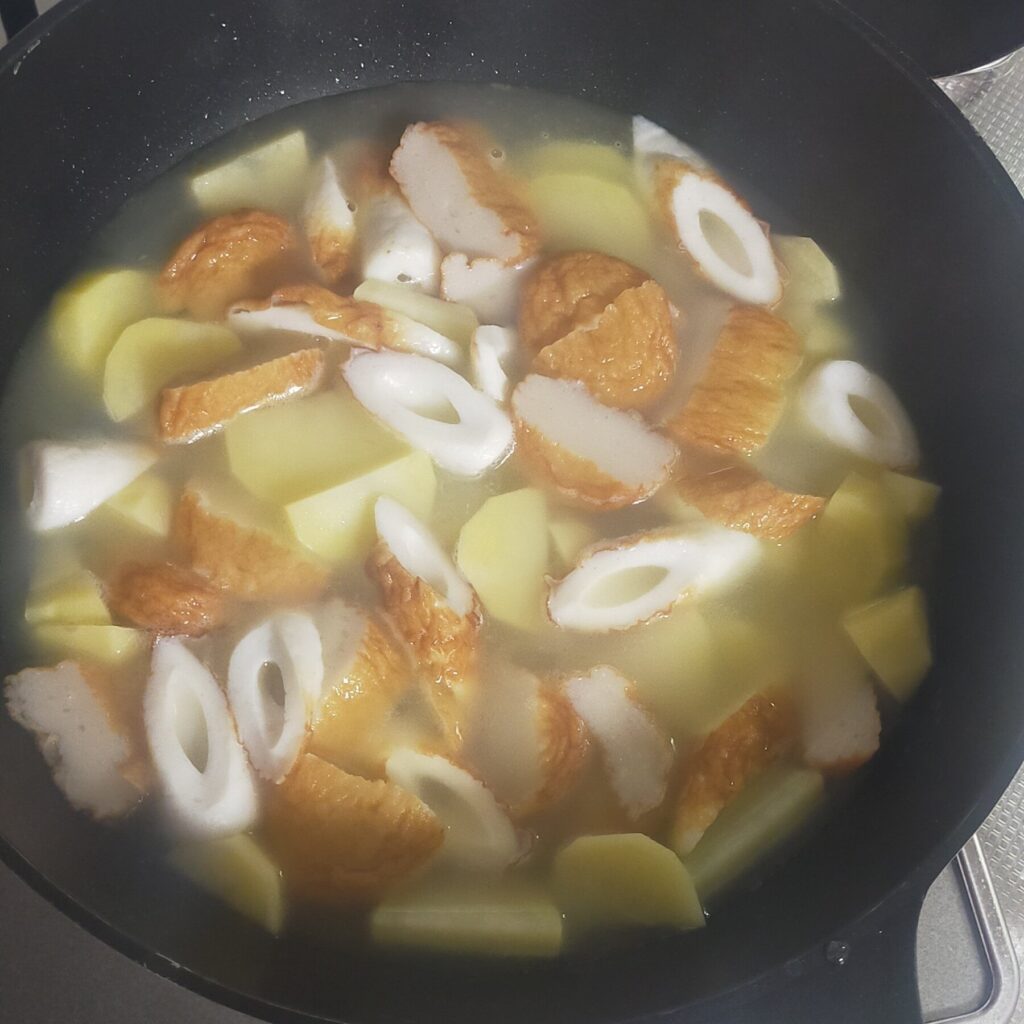 水気が無くなってきたら少し火を強めて、煮崩れたじゃがいもをちくわやさつま揚げに絡めるように混ぜ合わせる。