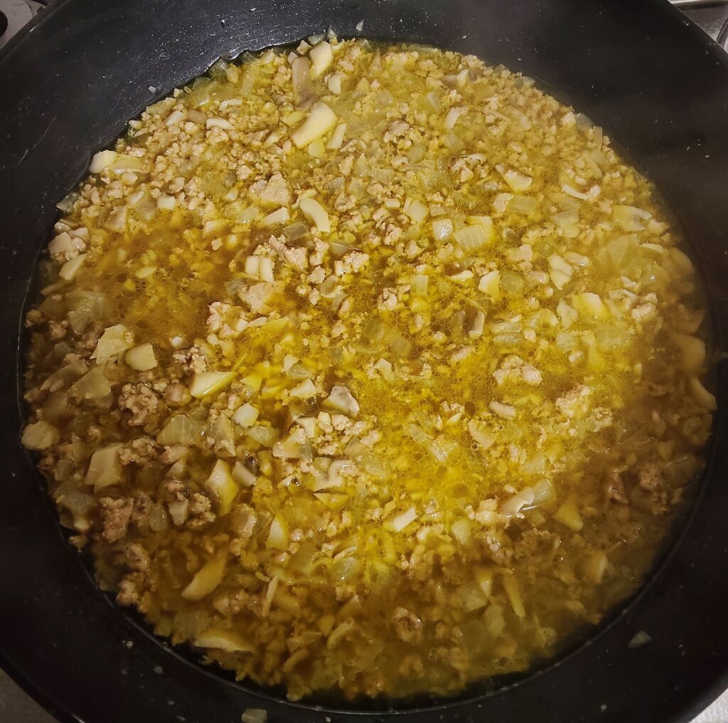 フライパンに水(400ml)、合い挽き肉(約200g)、チューブにんにく(少々)、チューブしょうが(少々)を加えてよく混ぜて火にかける。