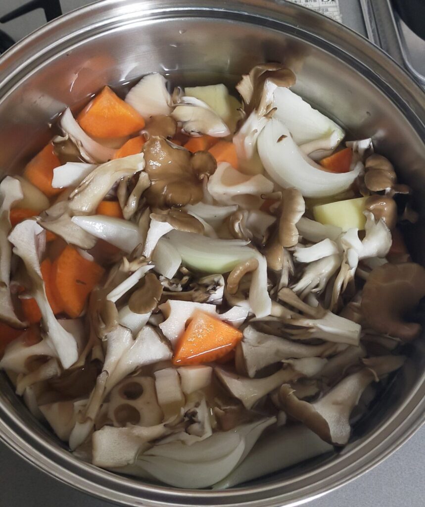 鍋に水(1000ml)と①のじゃがいも、蓮根と②の玉ねぎ、人参、舞茸を加えて中火でひと煮立ちさせる。