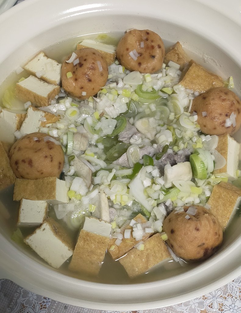 厚揚げとがんもどきをのせて鶏がらスープ(鶏がらスープの素:小さじ1 水:650ml)をかけ、にんにくをちらして、蓋をして中火で熱する。