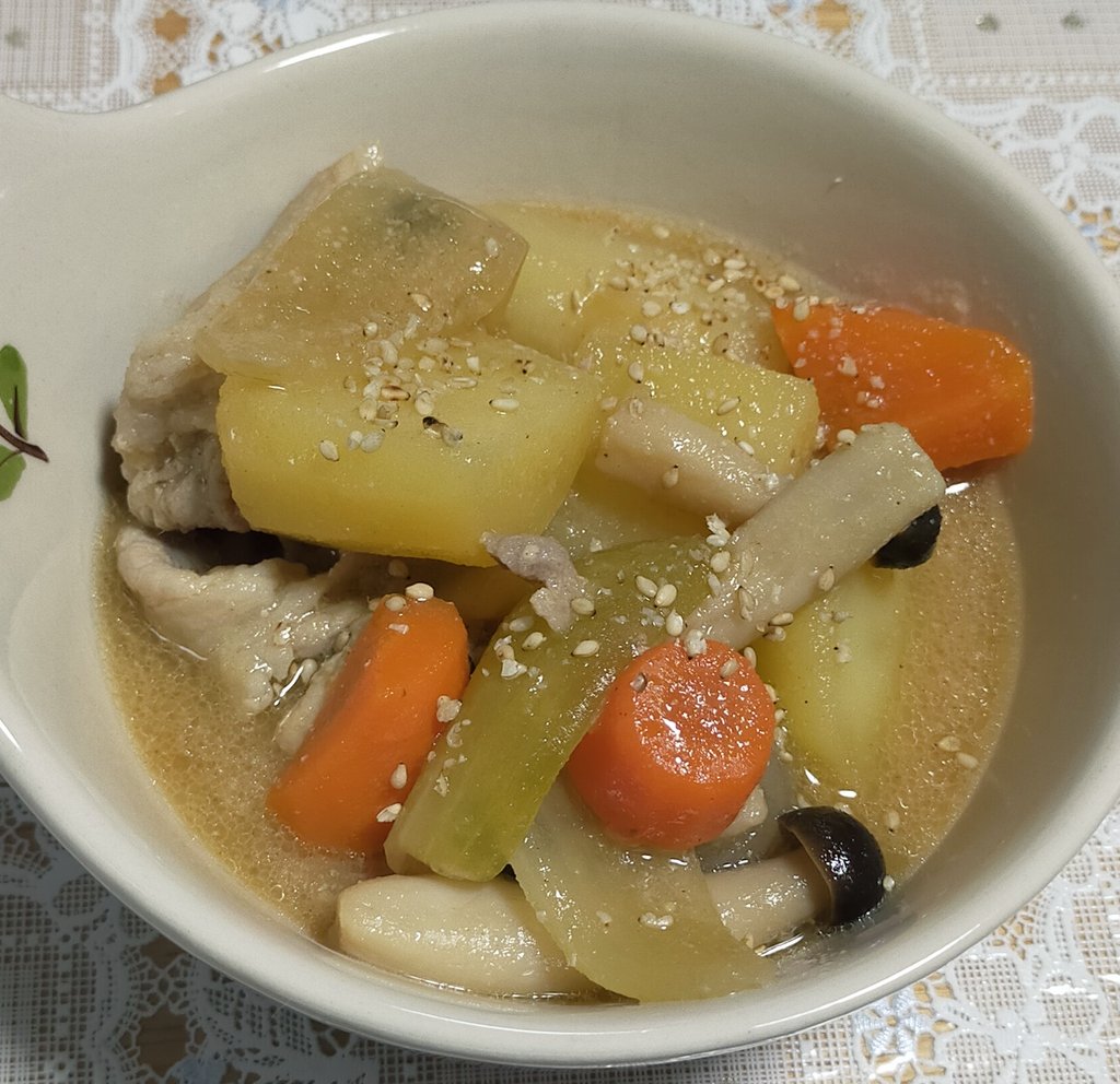 味噌(大さじ4)を加えて溶かし、約5分煮込む。