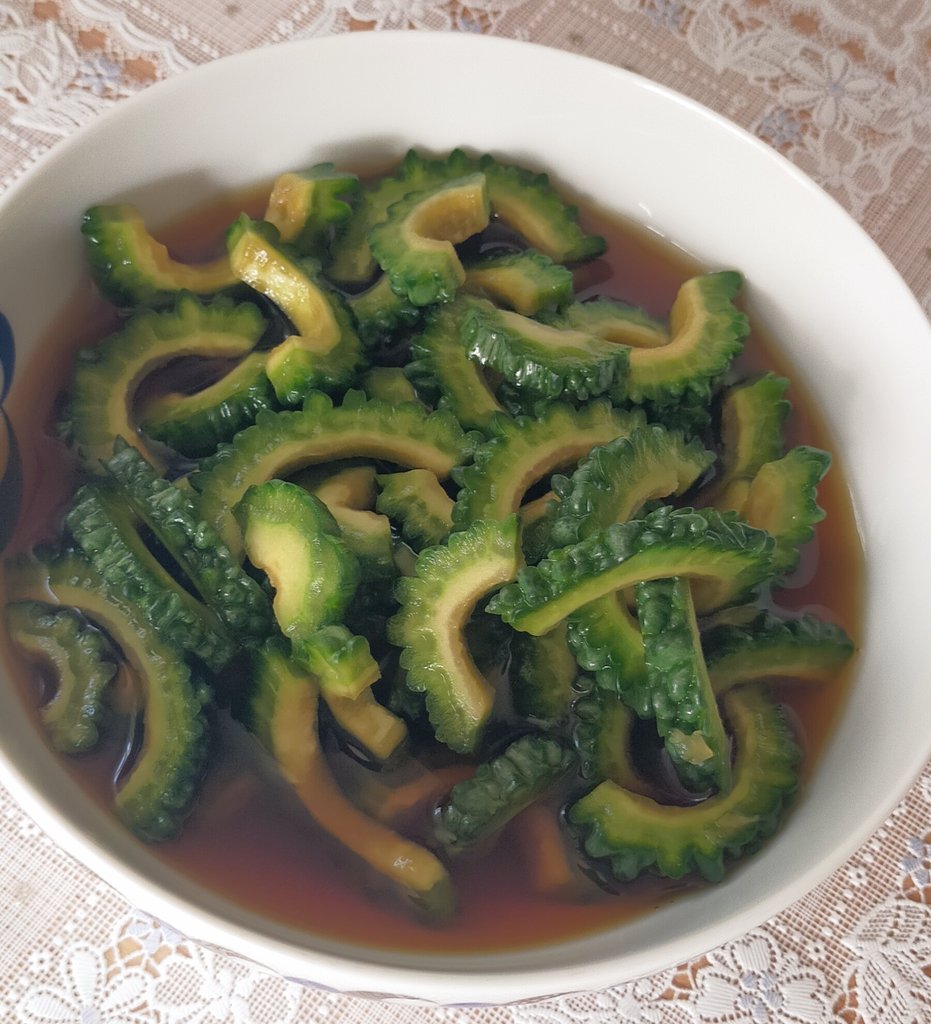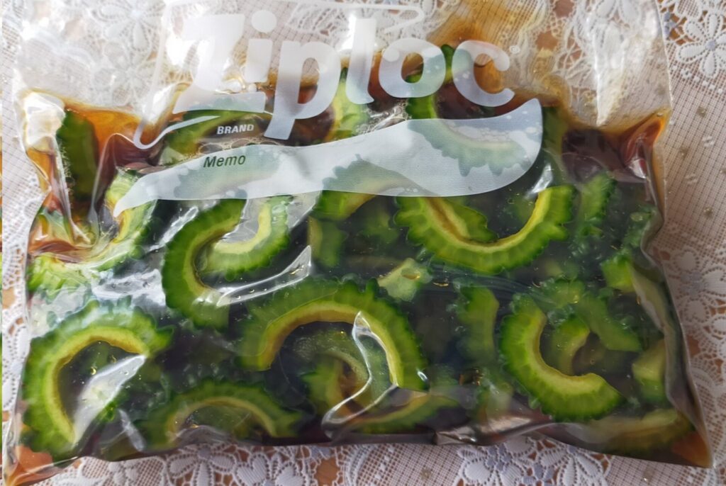 ジップロックに①のゴーヤと②の漬け汁を入れて軽く揉む。