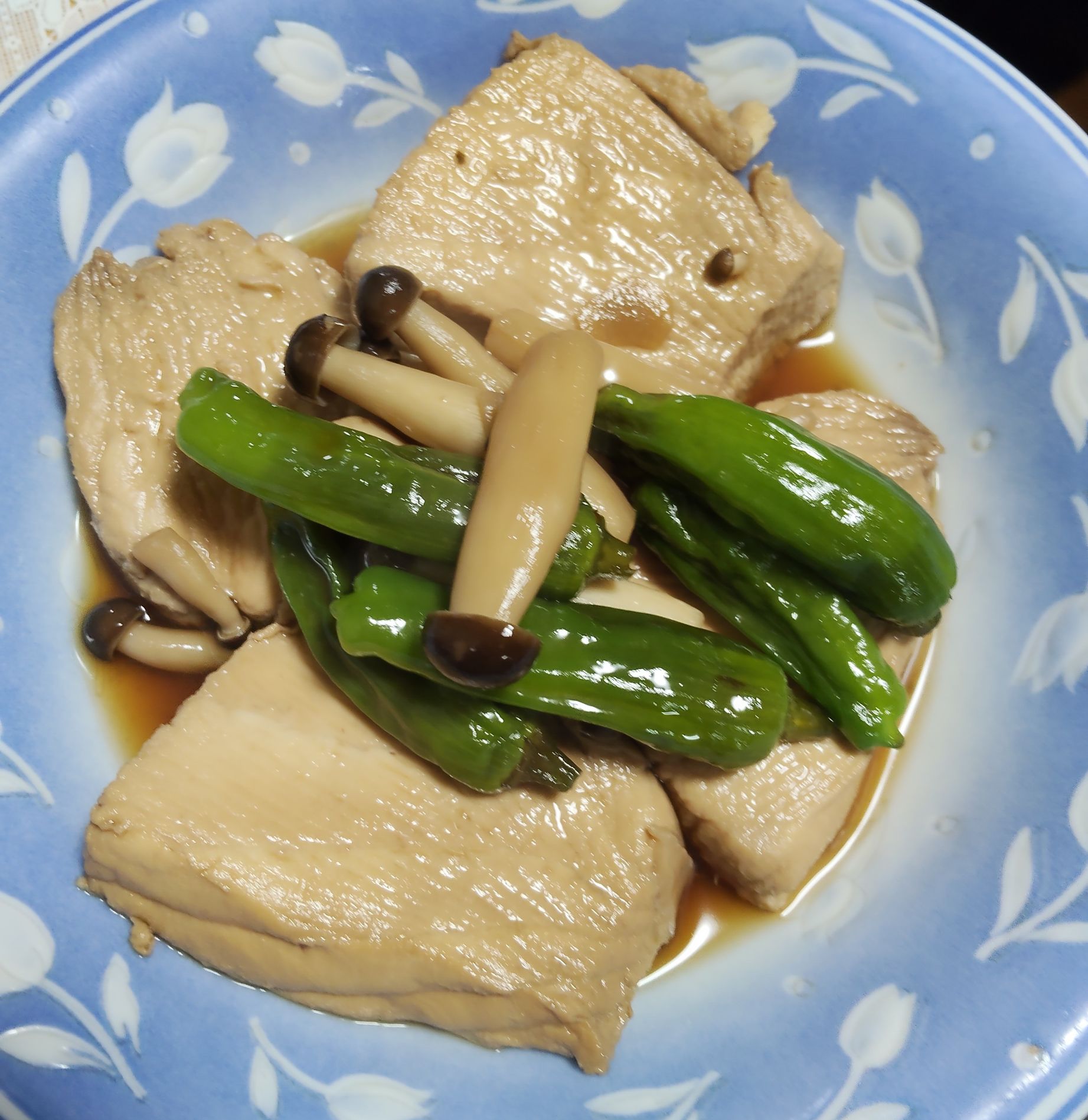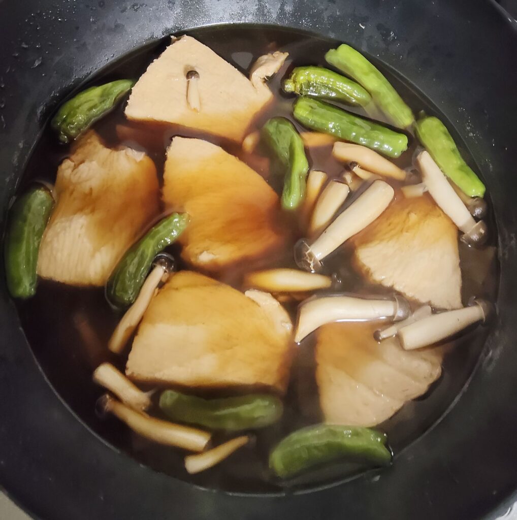①のししとうとカットしめじをフライパンに加えて更に10分程度弱火で煮込む。