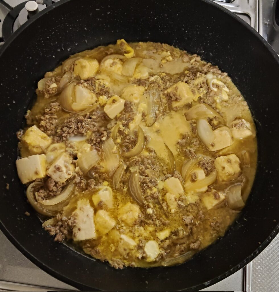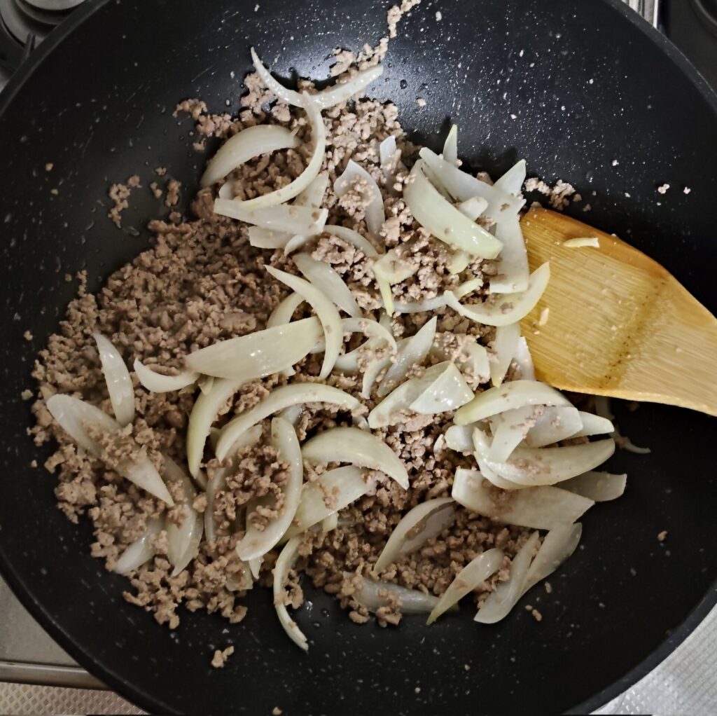 ひき肉に火が通ったら①の玉ねぎを加えてしんなりするまで炒める。