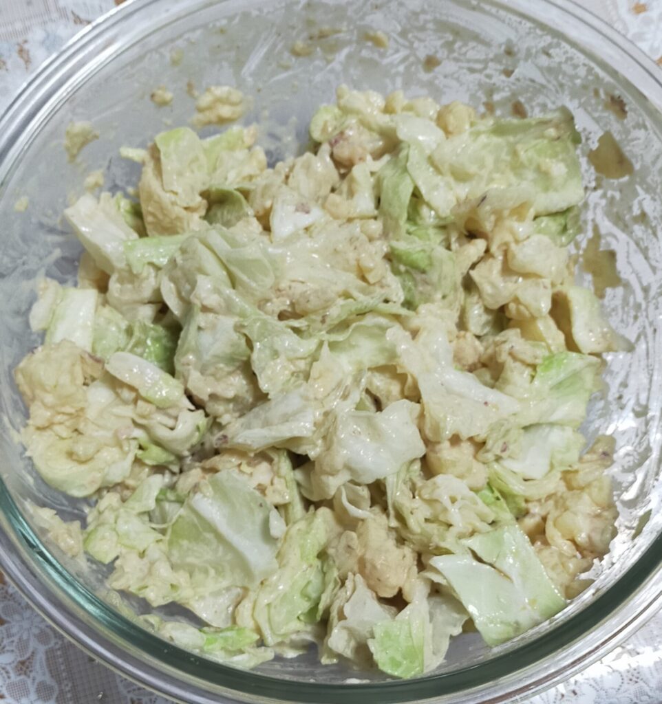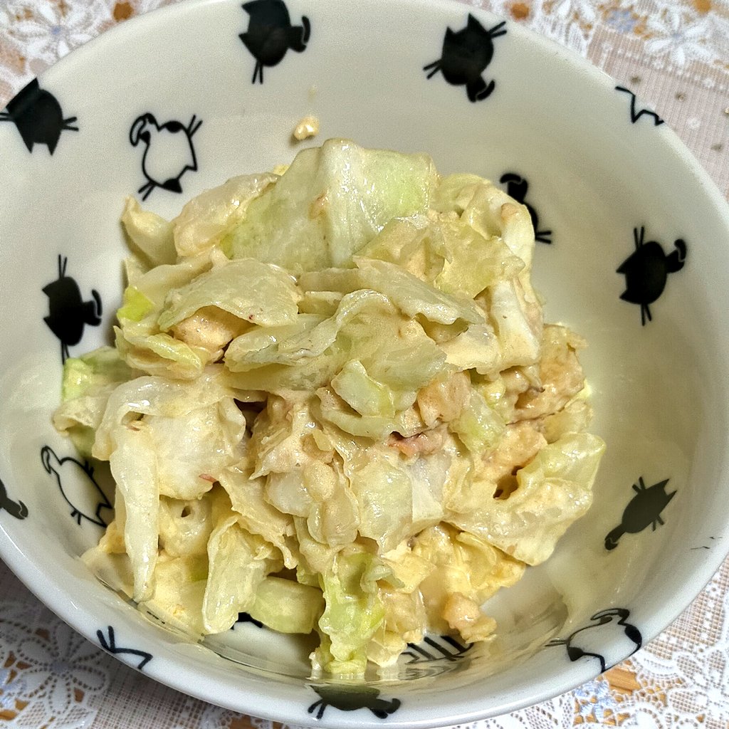 ②のボウルに①のキャベツと醤油(大さじ1)、マヨネーズ(大さじ4)、かつお節(2パック/8g)を加えてよく混ぜる。